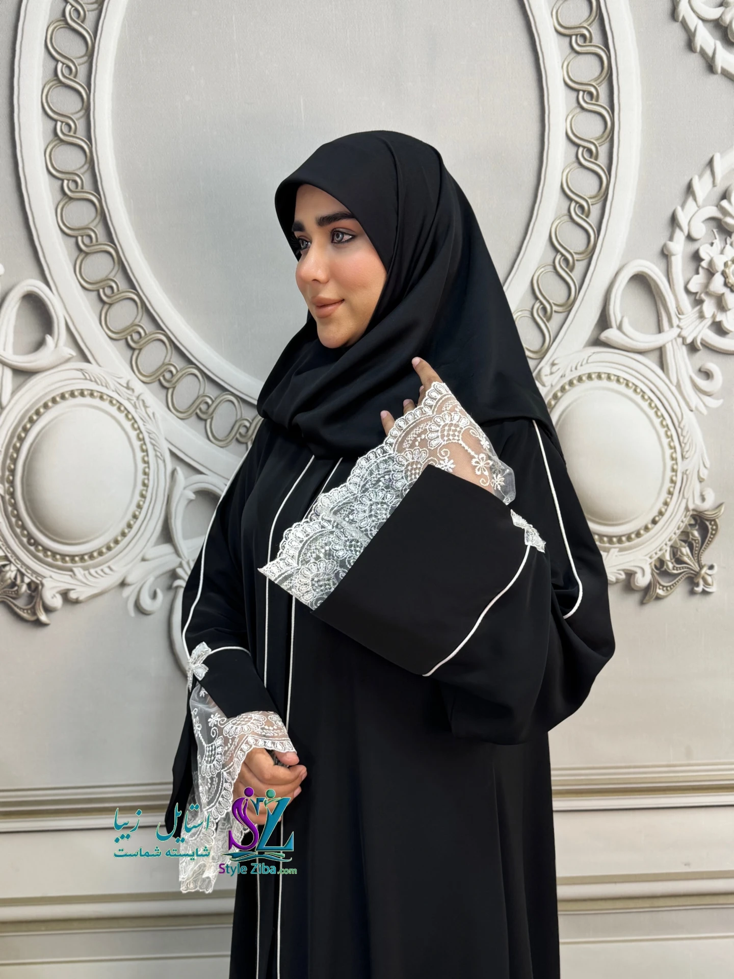 مغزیدوزی سفید در کنار گیپور ظریف و پاپیون گلدوزی شده، جلوهای خاص و متفاوت به این عبا زنانه داده و آن را از مدلهای ساده متمایز کرده است.