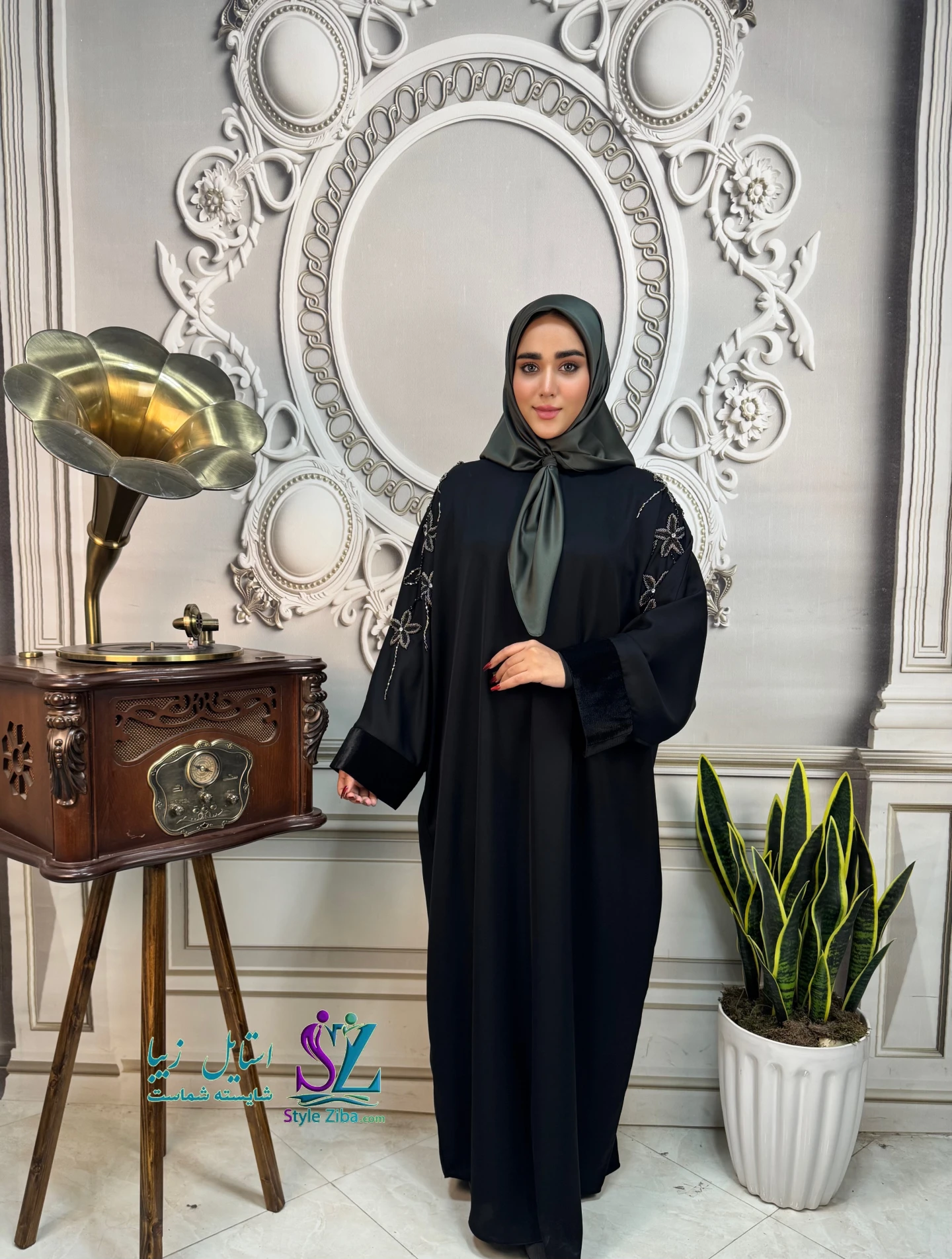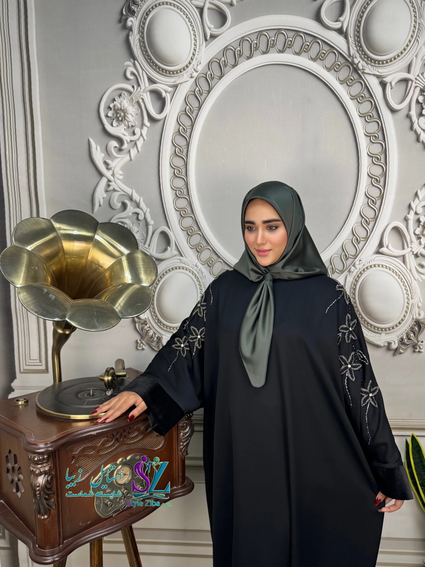 عبا مجلسی زنانه زوفا با جنس کنکن مشکی و گرم بالا، فریسایز مناسب سایزهای ۳۸ تا ۴۸ است. جواهردوزی گلدار در کنار سرآستین مخمل، این عبا را به انتخابی شیک و خاص برای خرید عبا زنانه و عبا مجلسی تبدیل کرده است.