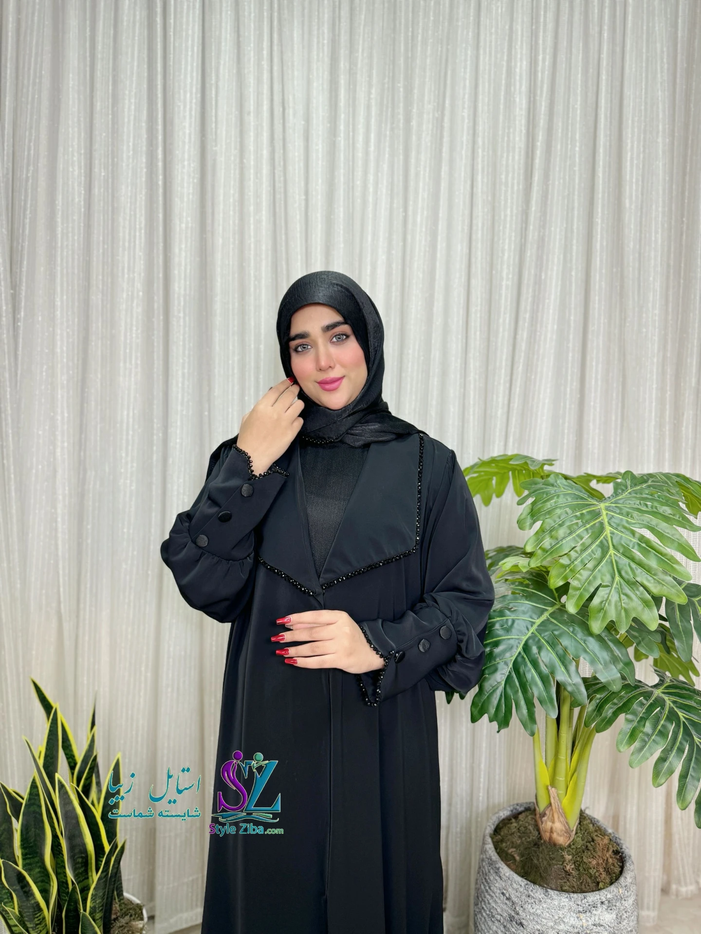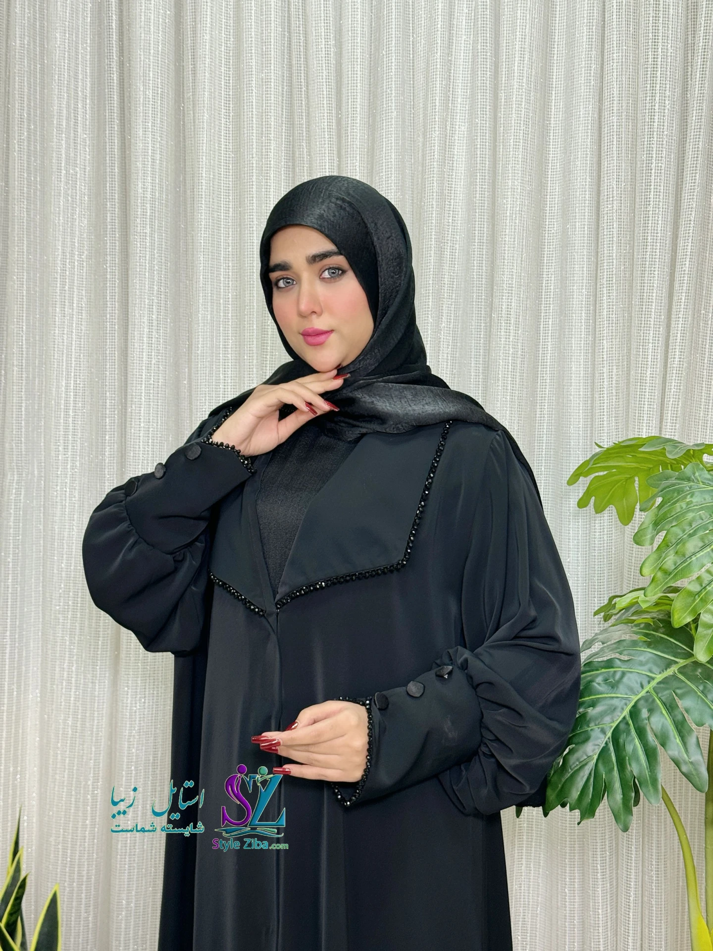 عبا مجلسی زنانه هانیه از جنس الیزه مشکی با کیفیت بالا، فریسایز ۳۸ تا ۴۸. جواهردوزی مچ و یقه انگلیسی با دکمه جفتی جلو، آن را شیک و رسمی کرده است.