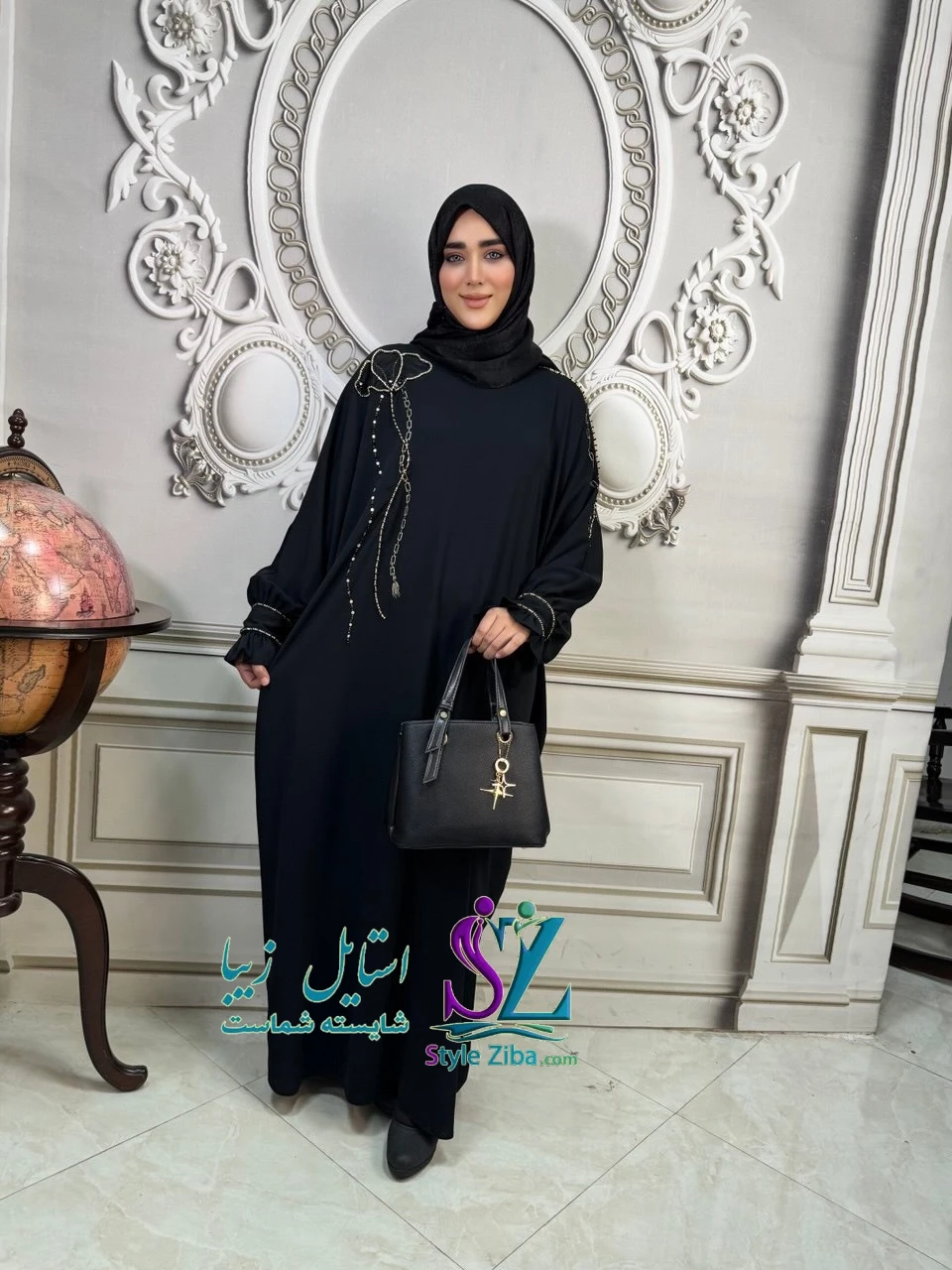 تزئینات این عبا مجلسی مشکی شامل جواهردوزی ظریف به همراه نقاشی هنری روی سرشانه و آستینها است که جلوهای خاص و متفاوت به عبا داده و آن را از مدلهای ساده متمایز میکند.